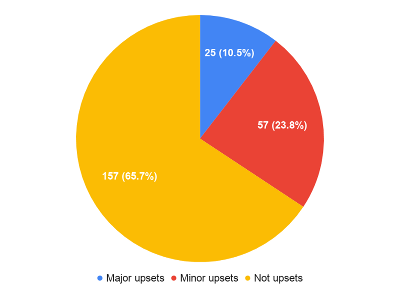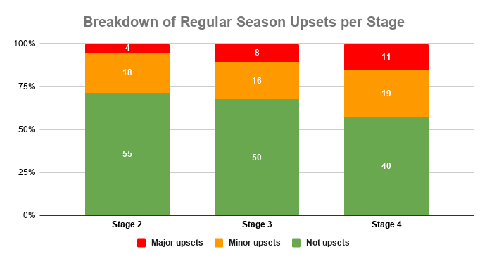 Of the 239 matches played between stage 2 and the Grand Finals, 82 were upset matches, around 34% of matches. Of these 25 were classed as major upsets, i.e. where the gap between the teams was seven places or higher, with 58 minor upsets. Overall approximately 10% of matches were major upsets.