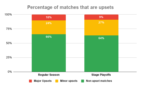There was almost no difference in the overall likelihood of upset matches in stage playoffs when compared to regular season matches, across both major and minor upsets. This is reflected in the experience of watching the playoffs, where most matches were as competitive as the regular season.