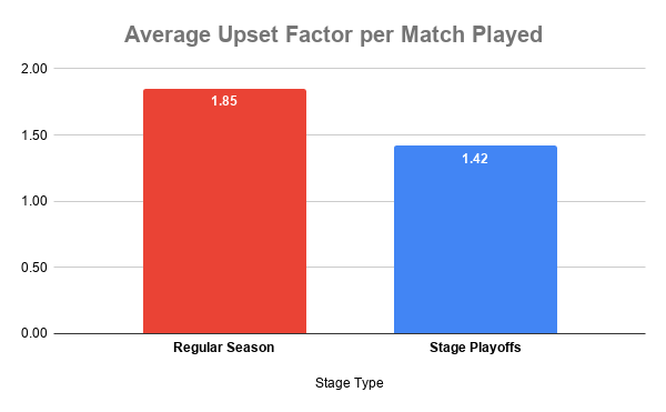 The average upset factor per match (including non upset matches) is 30% higher for the regular season matches compared to the stage playoffs.