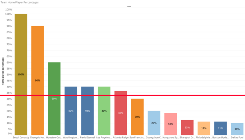 As a comparison I’m using the UK Premier League rules and applying them to the Overwatch League. It doesn’t directly apply due to the different roster sizes but it boils down to approximately 32% home-grown players. let’s take another look at our data to see how many league teams make the cut.